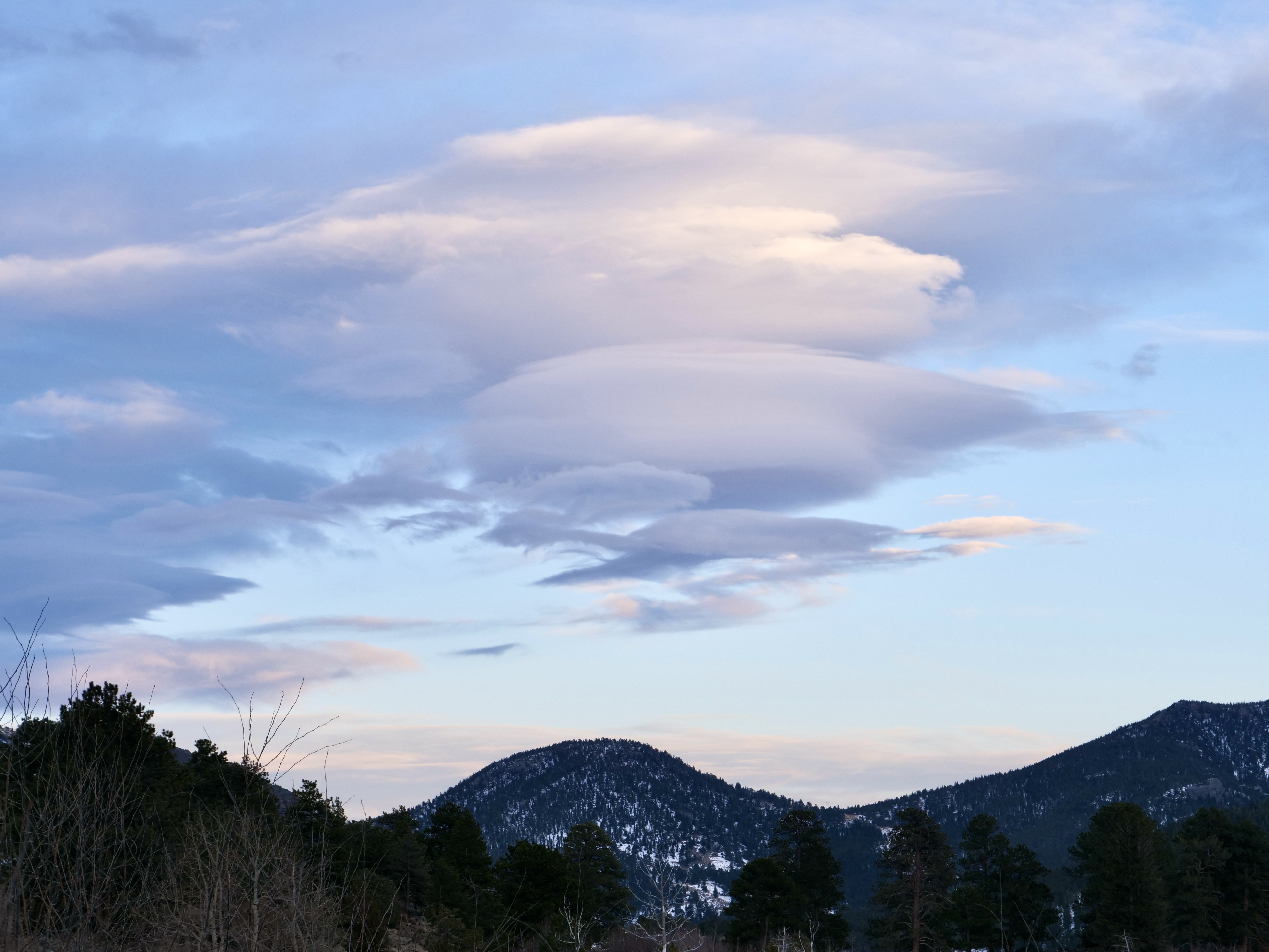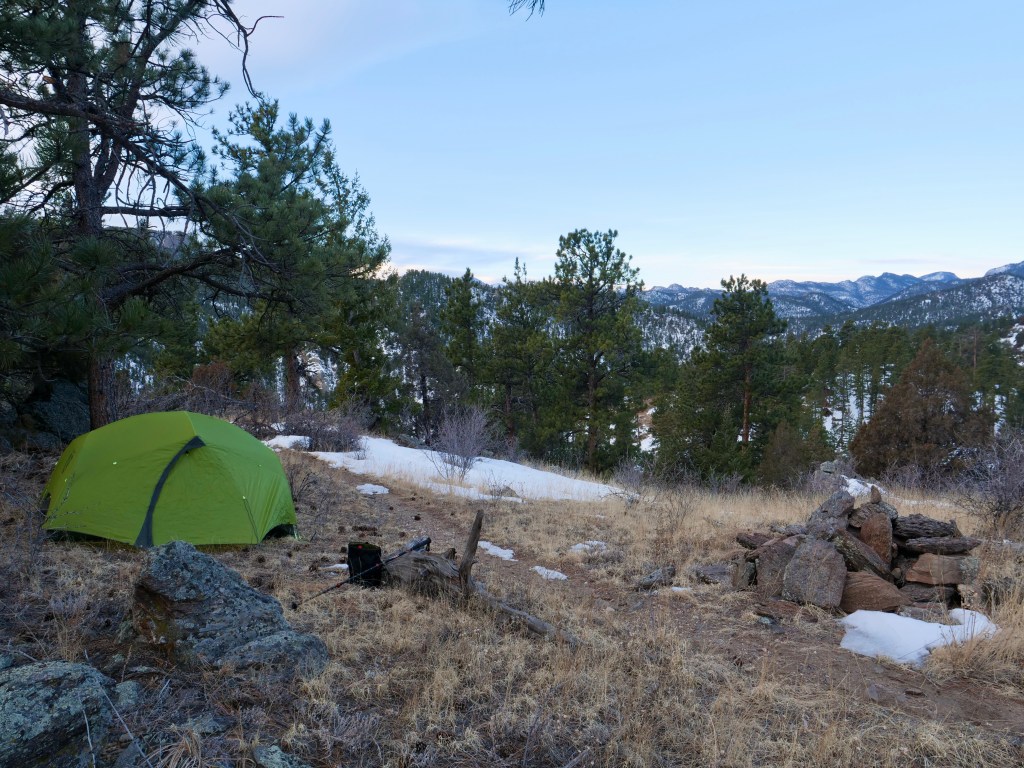 Anyway, I decided to bike towards Rocky Mountain National Park (RMNP) from Fort Collins and pitch the tent somewhere on the way before sunset. Normally I can make it to RMNP in a day but I was off to a late start. Packing and setup took longer than expected but it’s also a new approach bringing snowshoes and everything. In addition to the bike setup I carry a 58 L lightweight pack so I can pack everything into that when I transition to hiking or snowshoeing and lock the bike somewhere in the woods. Check out the setup below…
