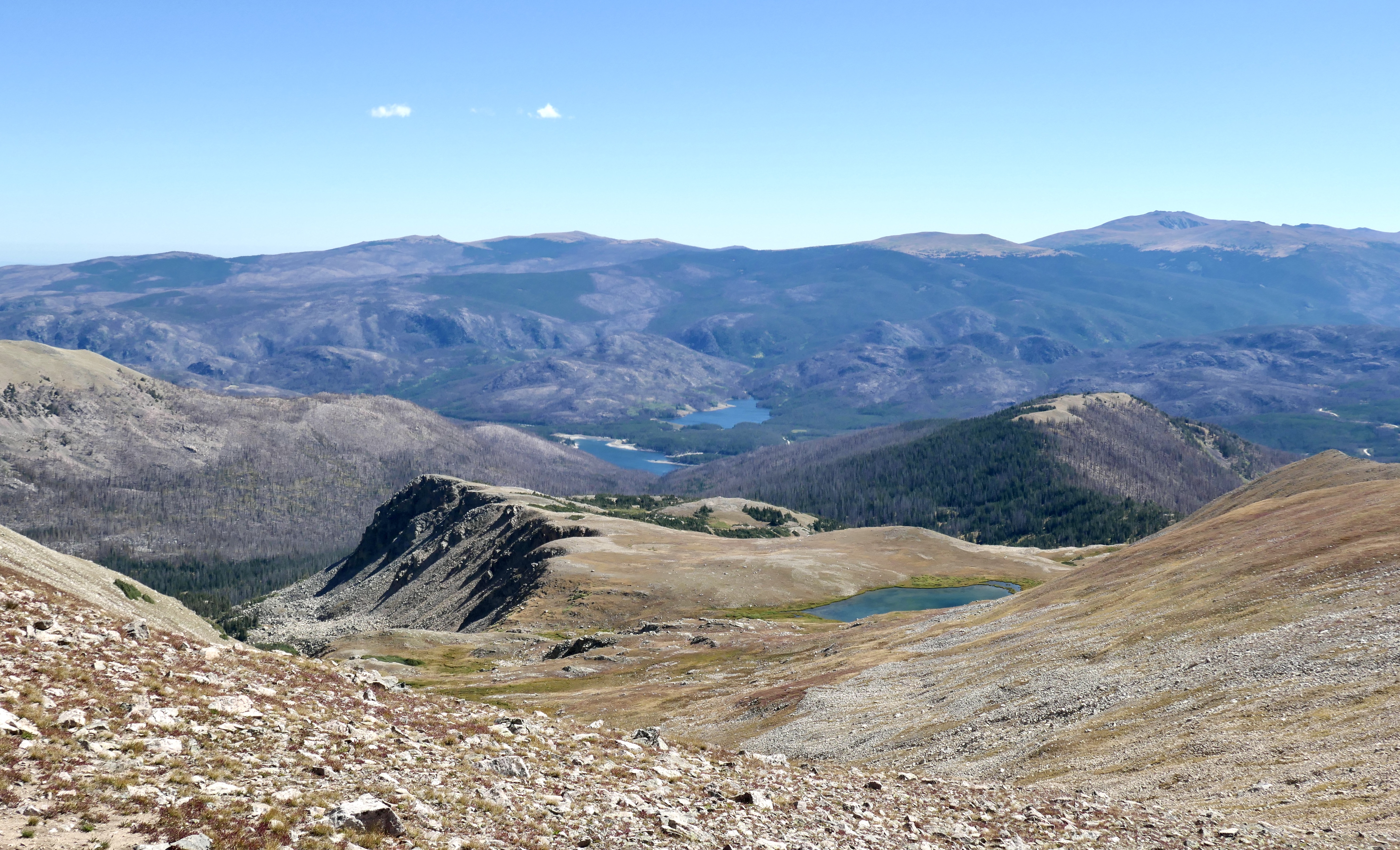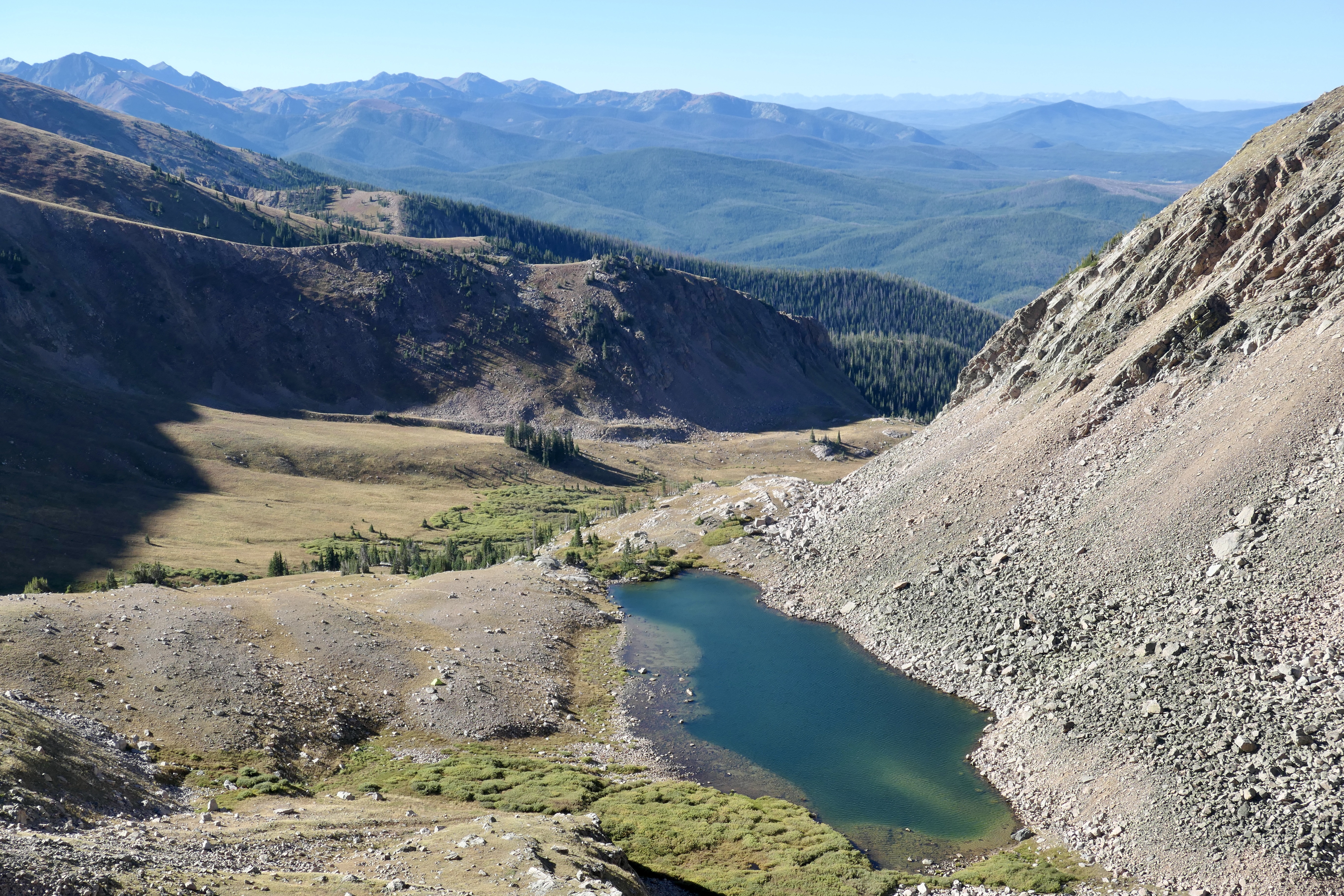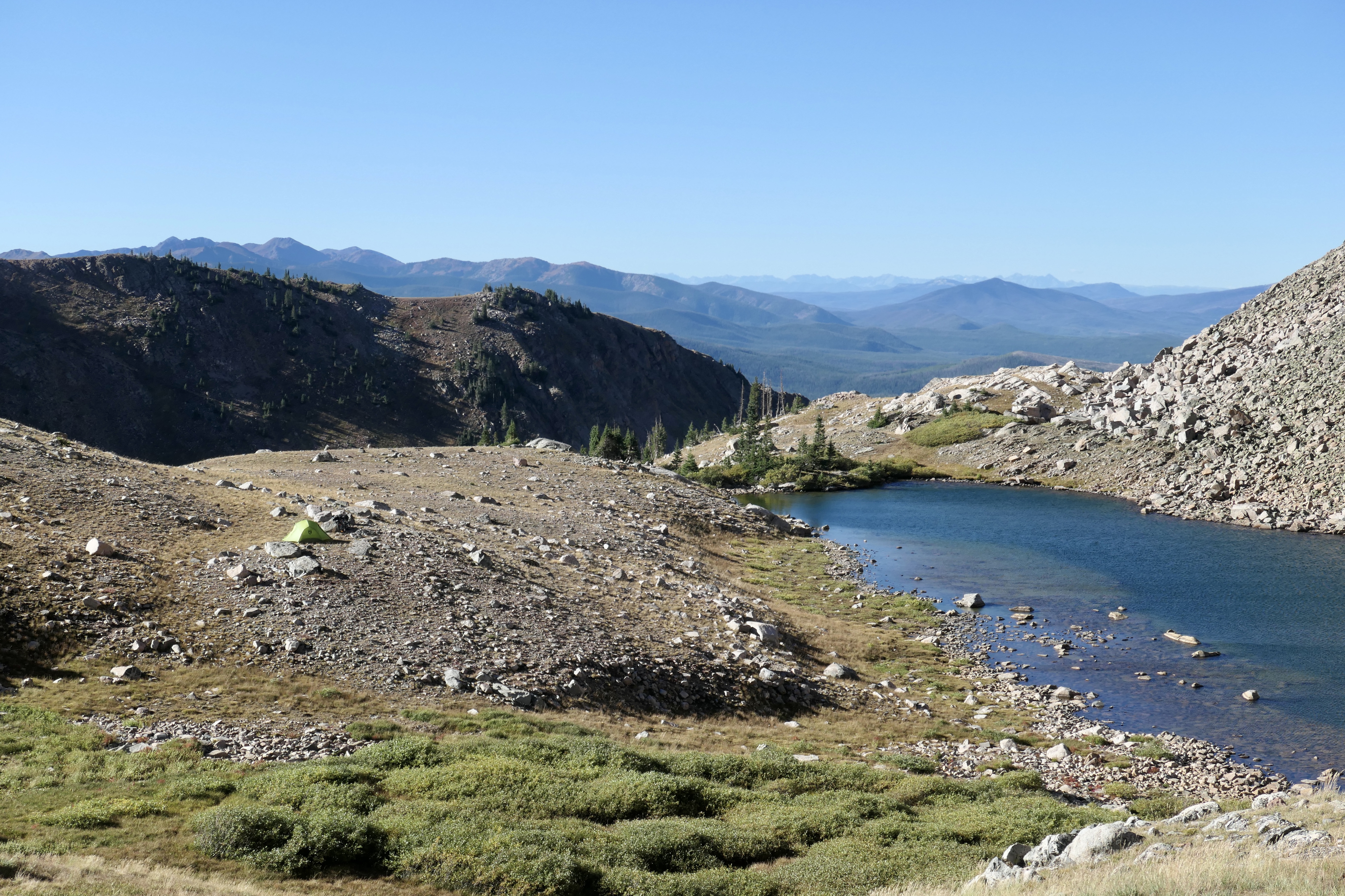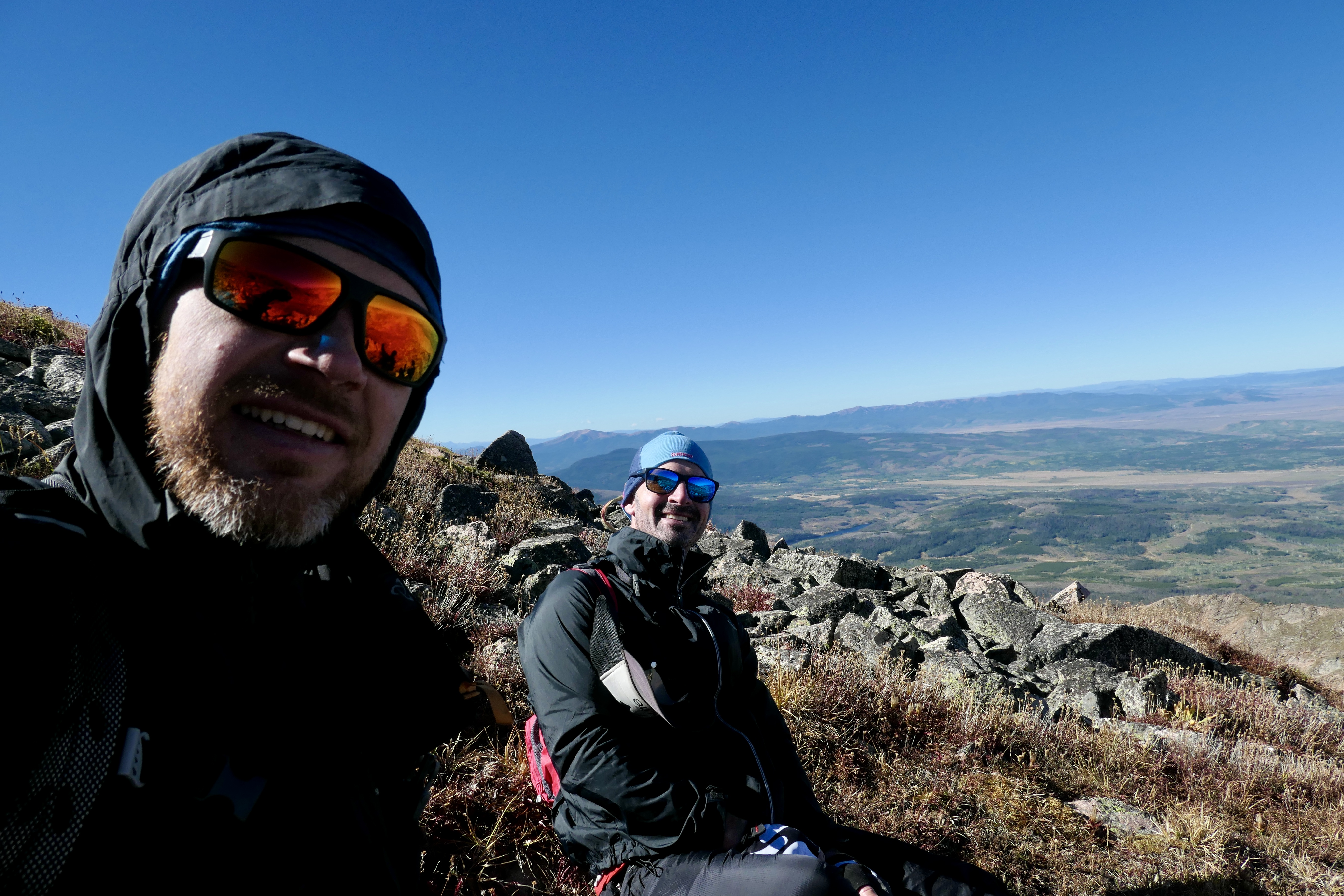 The plan was to climb Clark Peak scrambling up from the north side of the lake and loop around on the ridge as described in the book. Getting out of the tent was pretty cold but not freezing, also it was pretty windy so it felt a lot colder than it was. After some good coffee from the new stove system Josh stopped shaking and we started the scramble. It was steep but not technically difficult. It’s such a beautiful loop with amazing views into the Never Summer Wilderness and Rocky Mountain NP to the south, Rawah Wilderness to the east, Medicine Bow Range to the north and the flat area and Zirkel Wilderness to the west. Thankfully Josh located one of his nuts on the top, he was very happy since it has been lost for a while. The other one was nowhere to be seen so the search continues, but still, one is better than none!