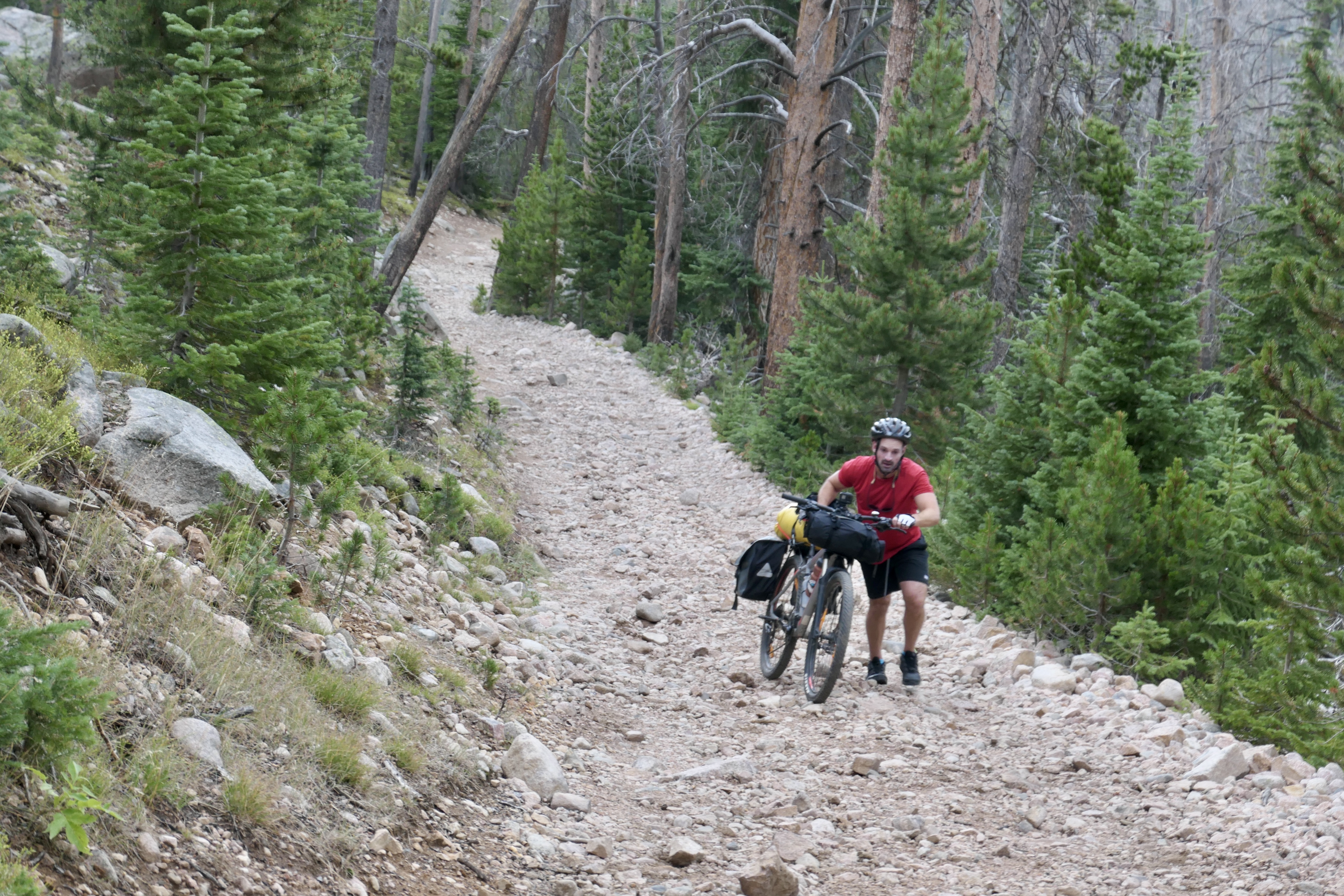 We were off to a great start hitting Bockman road which is a fun and beautiful 4×4 dirt road to ride. We passed by Bockman camping and hit the Fransisco Loop road that connects with Ruby Jewel road and eventually Ruby Jewel trail. The Ruby Jewel road is a very rough and steep 4×4 road that was very hard to bike with a big load so eventually we got more into pushing the bike and that’s what we did for more or less the rest of that day. The trail is beautiful going up into the valley of Jewel Lake below Clark Peak. Mountain biking the whole thing without load is definitely possible (if you’re in shape) and would be an awesome day adventure looping around Kelly Lake. In fact that’s the original route that I planned but we ended up staying by Jewel Lake for 2 nights instead.