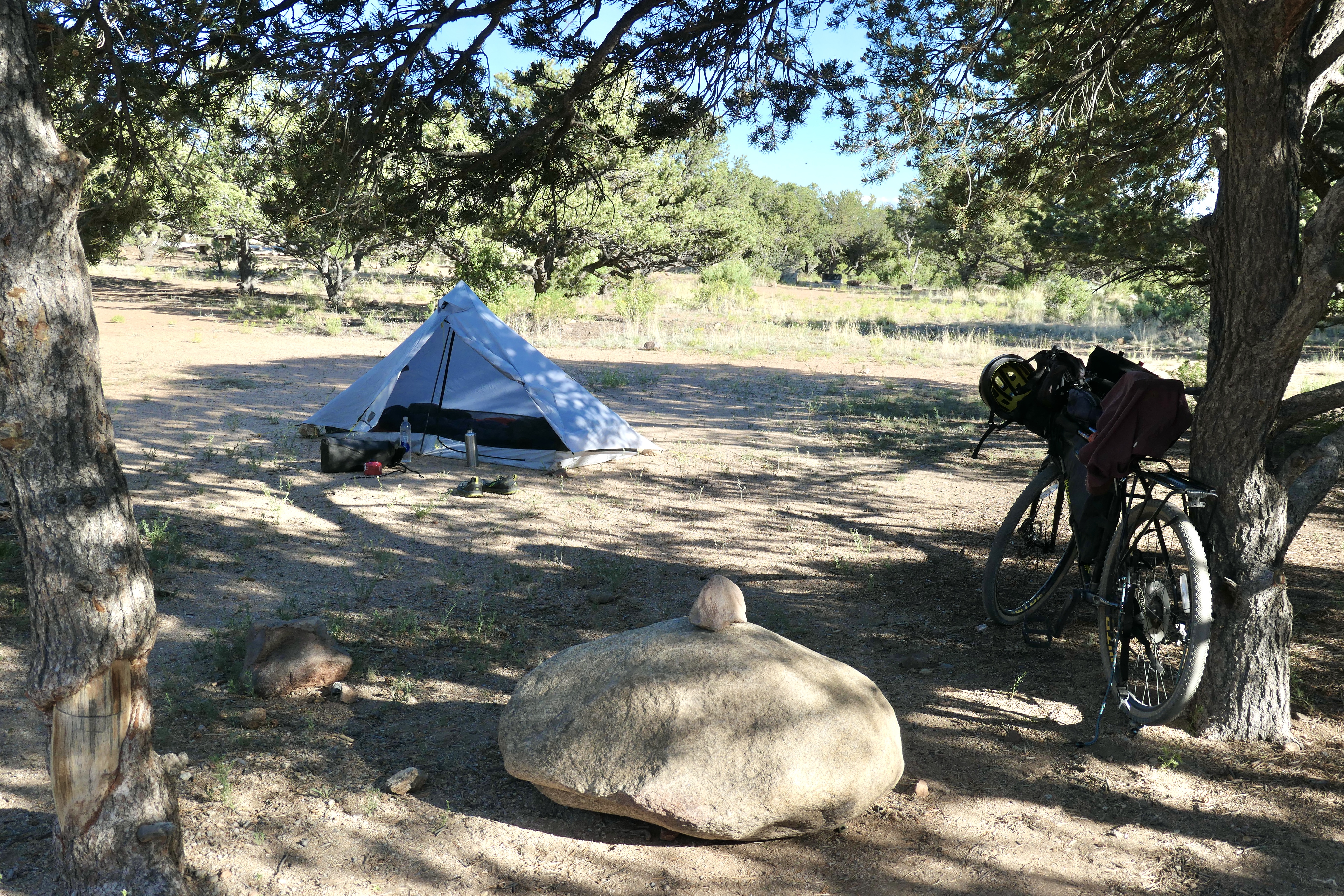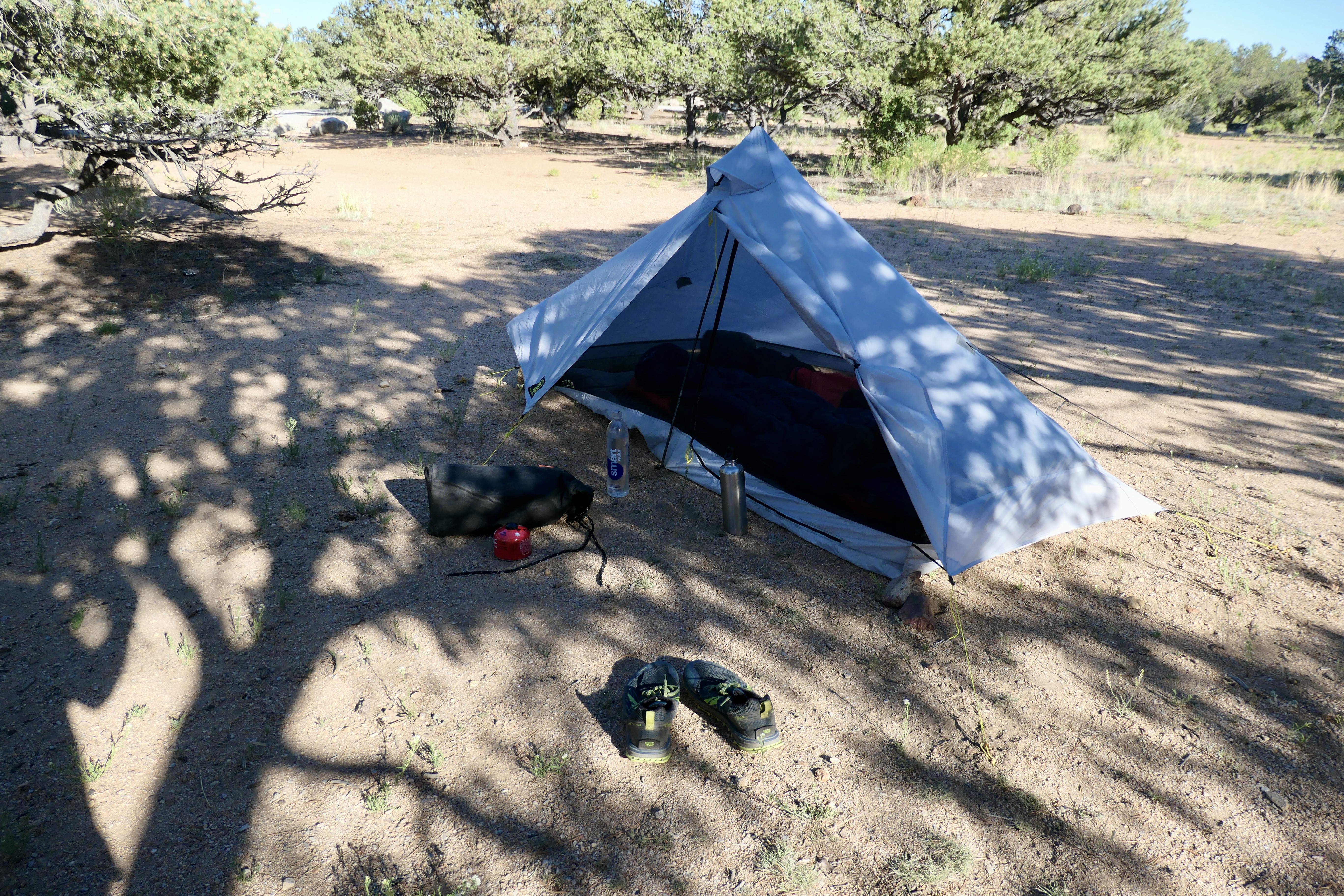 In addition to this I hiked 30 minutes ascending 151 m into the mountains to find a good spot for the tent. I would have liked to take more pictures up there but I was a bit late and it was getting dark and I had to figure out all the new routines with cooking and food handling. By the time I was done cooking and about to eat it was already dark, SUDDENLY I see 3 sets of eyes staring at me and immediately I go into fight mode thinking it’s mountain lions! Adrenaline runs through my body and I let them know I’ve seen them by letting out a short deep roar. One of them runs to the side and immediately I’m thinking they are attacking me by one flanking me and the other two going straight at me. To my own surprise I stayed pretty calm staying where I was and finishing my food but paying close attention with my headlamp. The two of them where still staying up there looking at me, I couldn’t see the third one anymore. I was at a pretty flat space so they couldn’t surprise me since I could see in all directions. I had my knife in my hand and was ready if something happened. However, nothing happened and they probably just wanted to check me out or maybe they had been there the whole time and I didn’t see them until then. I never found out if it was mountain lions. Thinking about it afterwards my best guess would be coyotes since they were the only tracks I could find. I packed my food into the Opsacks and into the Ursack, tied the Ursack to a tree and went back to my tent. Once I was in the tent I was pretty calm and ended up with a descent sleep…I didn’t get up next morning until after sunrise though.
