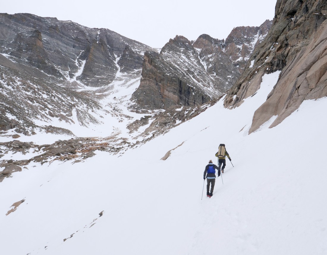 The Longs Peak Trail begins from the parking lot and is very easy to find. The trail goes through the forest and once you get above the tree line the views start to open up, and what amazing views! Theres a plateau above the tree line that would be great for pitching a tent, I imagine people do it sometimes when they go to the top of Longs Peak if they want to break it into two days or more. In high season you have to have a permit in advance though. Thats part of why I love going to RMNP in winter, you can just go to Beaver Meadows Visitors Center and get a permit if you want to stay overnight. Anyway, once you get up to the ridge that runs south of the plateau you can either hike up to Longs Peak or go to Chasm Lake. In this junction there are great views also but I went along towards Chasm. There’s a part thats a bit sketchy in winter since it’s very steep and I had to walk on snow. Luckily it was overcast and pretty cold so the snow seemed firm. There was another guy, Sean, up there who wasn’t sure to cross either, so we talked a little bit. I actually decided it wasn’t safe and was about to turn around but then 55 year old climber, Dan, came along geared up and everything since he was gonna climb The Diamond the following day. He said it was safe to cross as long as the snow was still hard and we could just follow his footsteps. He looked like he knew what he was doing (in his own words: “FUCK YES I know what I’m doing!”) So we followed along…